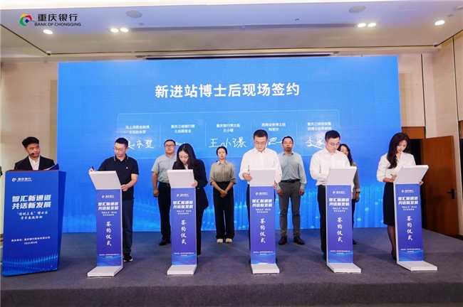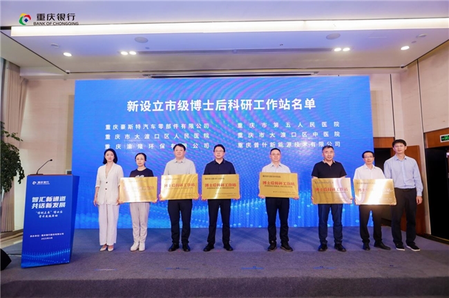 现场,重庆市博士后管理办公室为12家新设立的市级博士后科研工作站集中授牌。重庆银行股份有限公司、西南证券股份有限公司、重庆三峡银行股份有限公司,重庆三峡融资担保集团股份有限公司、马上消费金融股份有限公司5家单位分别与新入站博士后代表现场签约,引进高层次科研人才。