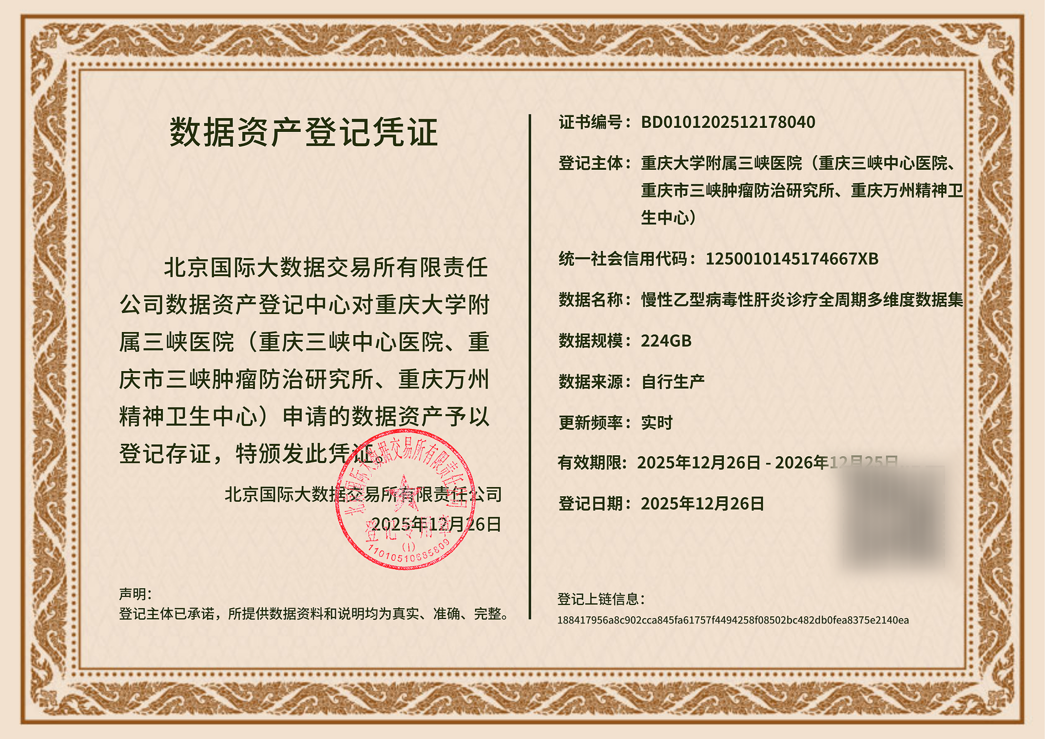 医院的NUT癌临床特征与诊疗关联数据集、慢性乙型病毒性肝炎诊疗全周期多维度数据集、食管早癌多模态临床诊疗数据集,成功获颁北京国际大数据交易所3张《数据资产登记证书》—— 这是西部首次3个病种同时获批医疗领域数据资产登记证书,标志着重庆在医疗数据要素市场化改革中率先迈出从“理论探索”到“实践落地”的实质性步伐。